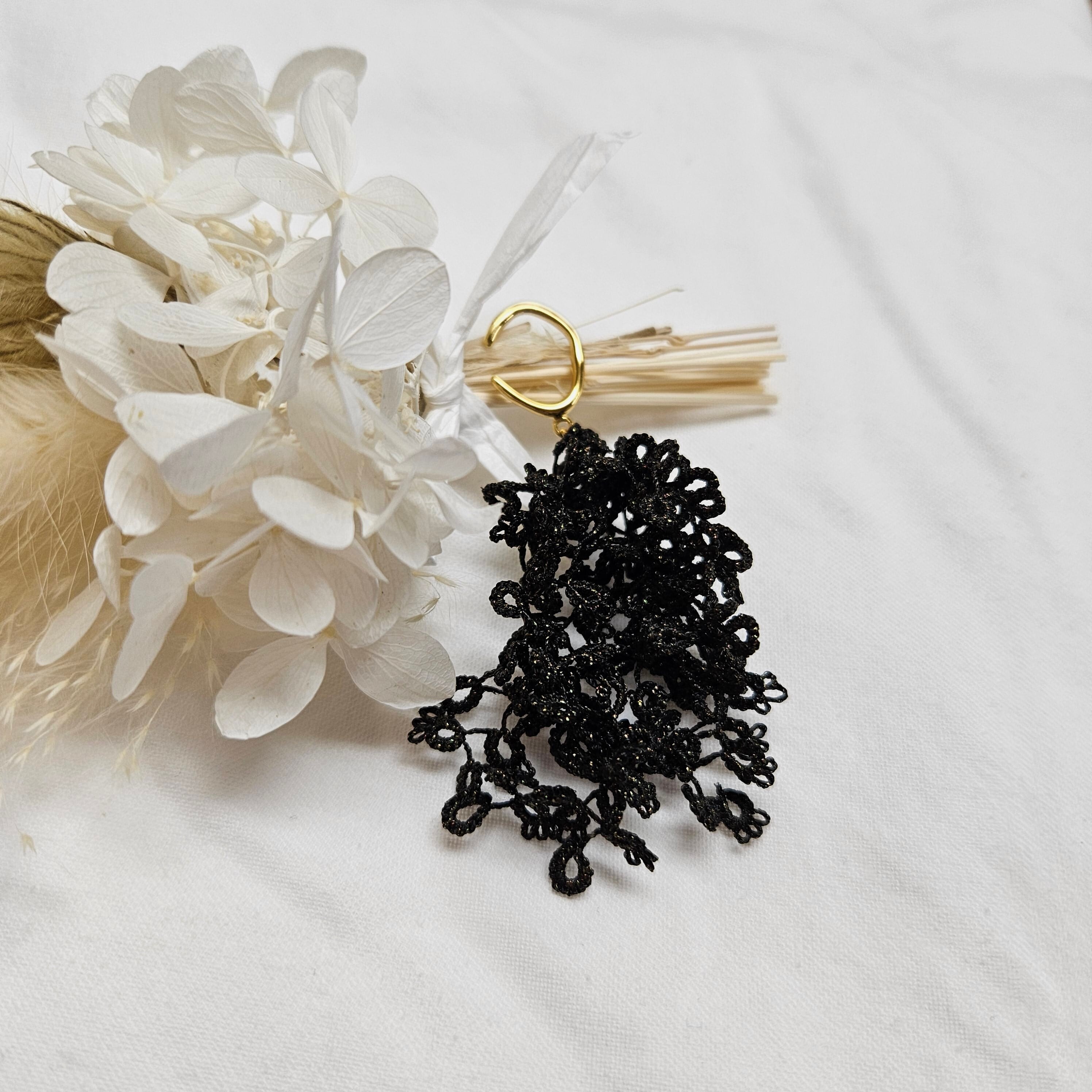 ブラックとゴールドの高級感あふれるデザインで、どんなスタイルにも合わせやすく、オンオフ問わずにお使いいただけます。モチーフには、手作業で繊細なレースを結い、女性らしい可愛らしさを表現しています。